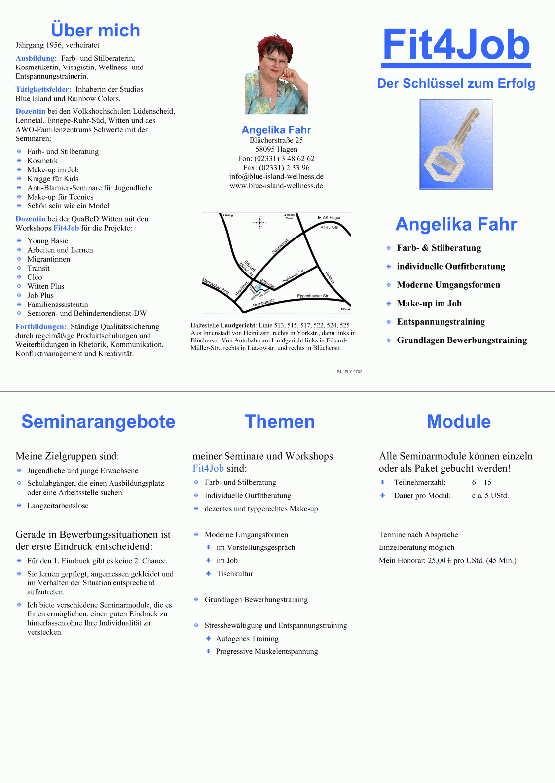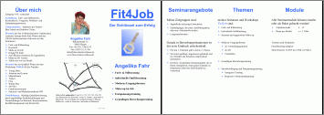 Themen meiner Seminare und Workshops Fit4Job sind:Diese Workshops führe ich bereits erfolgreich bei verschiedenen Volkshochschulen und Bildungseinrichtungen durch. Mehrere lokale Zeitungen und der WDR 2 (Mittagsmagazin) haben darüber sehr positiv berichtet.